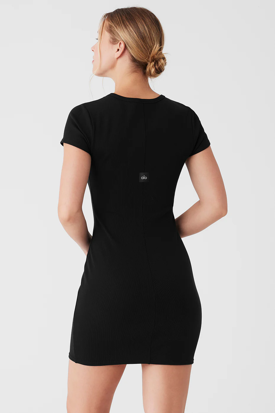 Alo Yoga Goddess Ribbed Short Sleeve Dress – Black