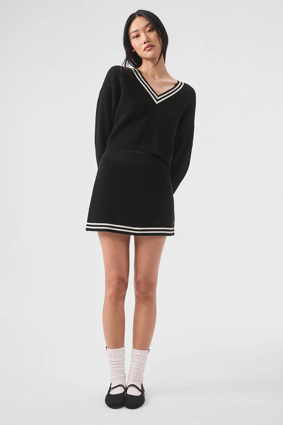 Alo Yoga Tennis Club Sweater Knit V-Neck Pullover – Black/Ivory